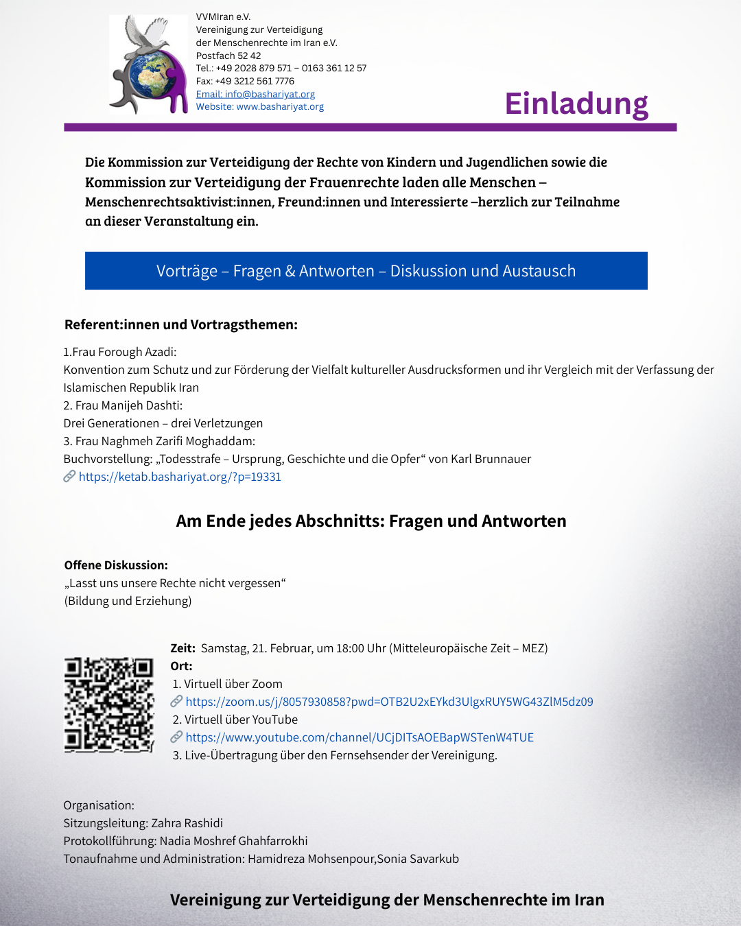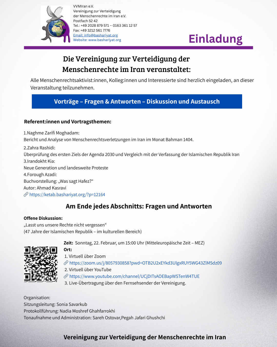 Einladung zur Generalversammlung des Zentrums für die Verteidigung der Menschenrechte im Iran am Sonntag, dem 22. Februar 2026, um 15:00 Uhr (MEZ) im virtuellen Zoom-Raum.