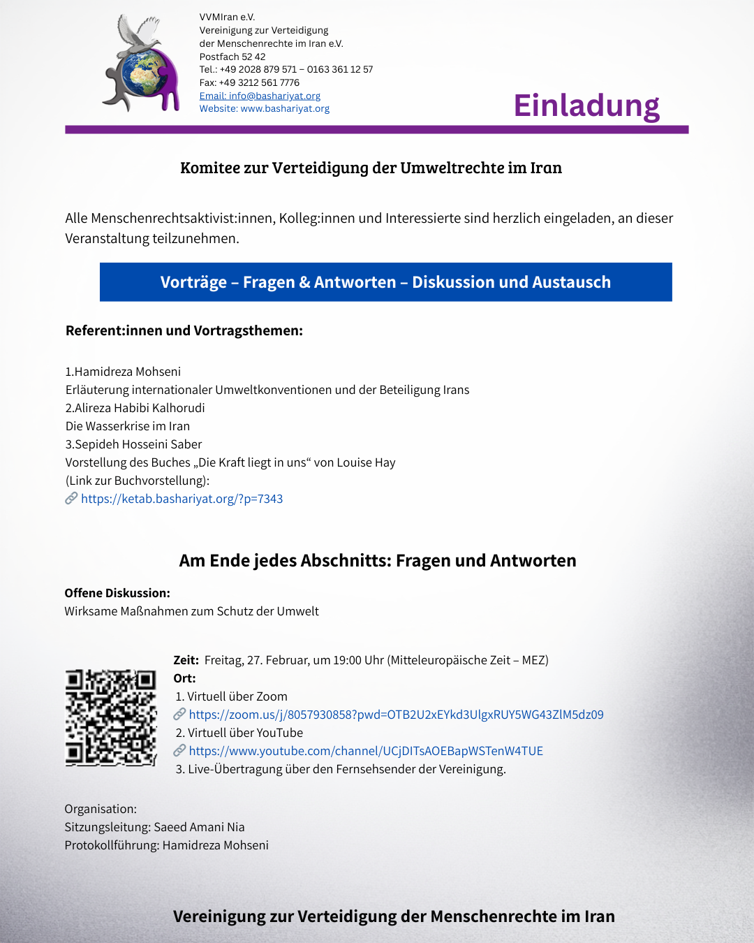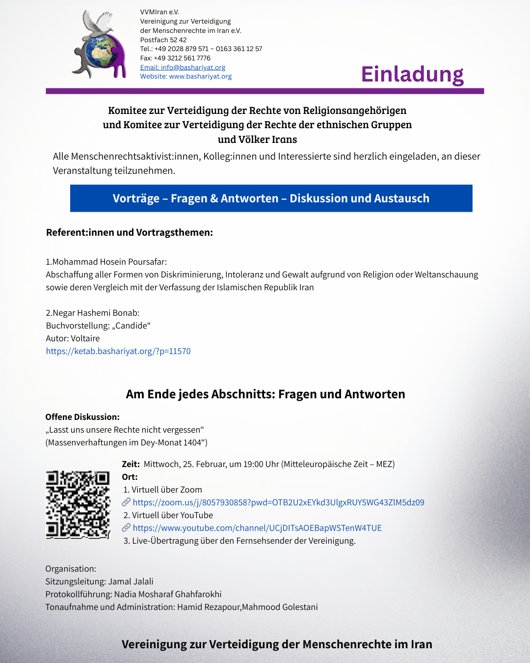 Die Sondersitzung der Regionalvertretung Norddeutschland der Vereinigung zur Verteidigung der Menschenrechte im Iran fand am Montag, dem 9. Februar 2026, um 18:00 Uhr (Mitteleuropäische Zeit – Weiterlesen