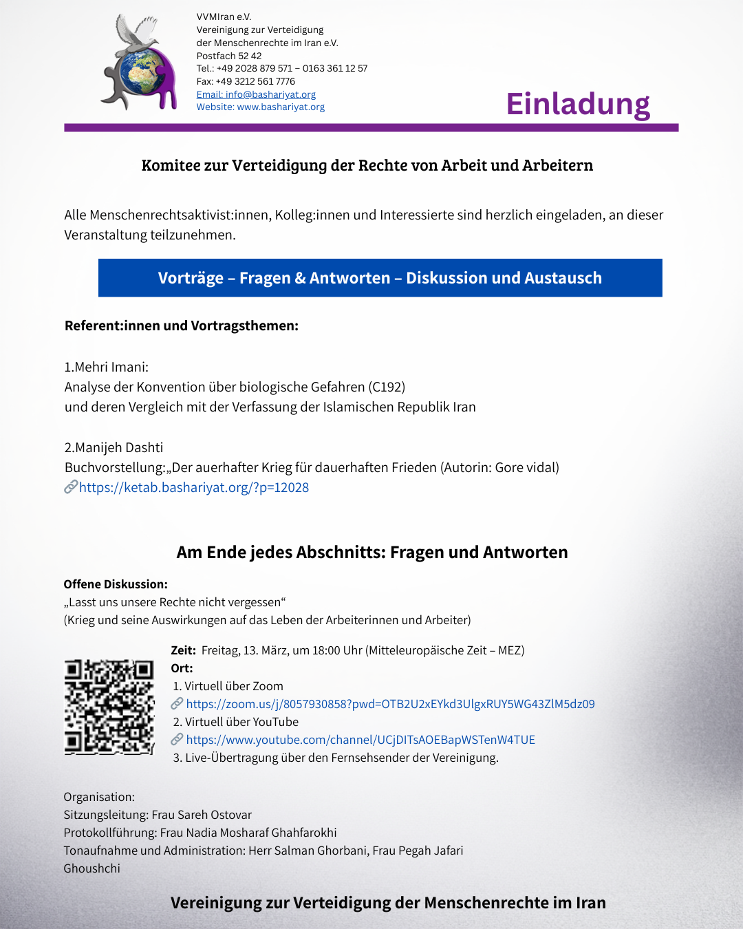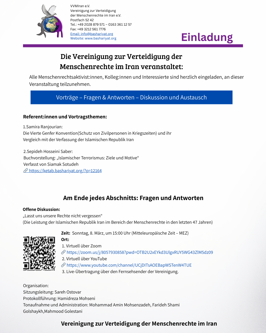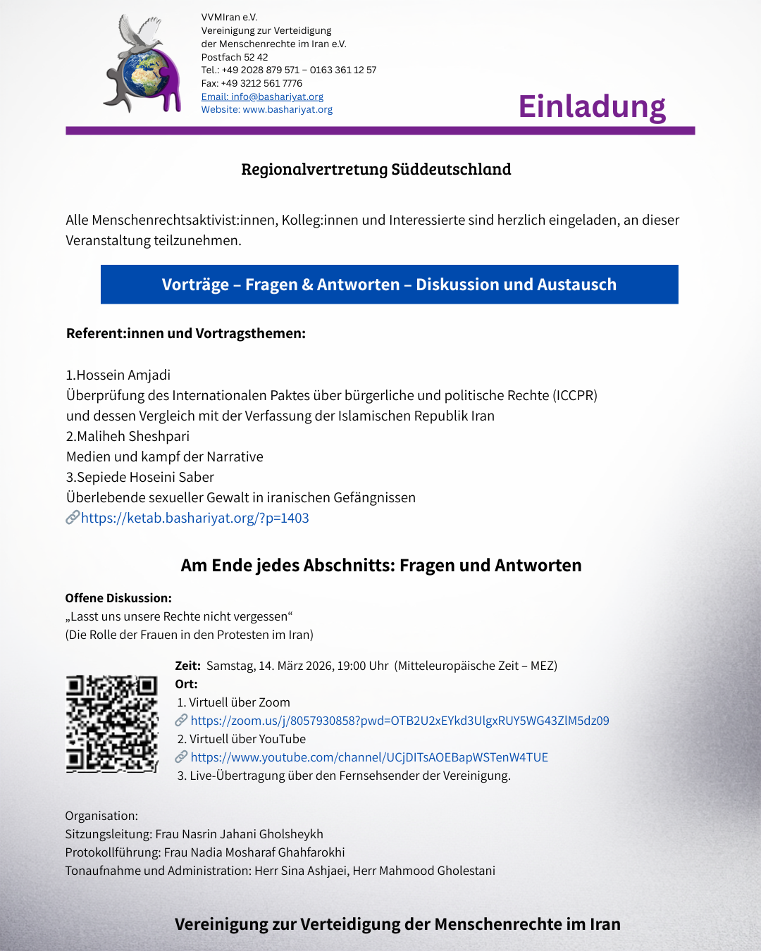 Einladung zur Generalversammlung des Zentrums für die Verteidigung der Menschenrechte im Iran am Sonntag, dem 8. März, 2026, um 15:00 Uhr (MEZ) im virtuellen Zoom-Raum.