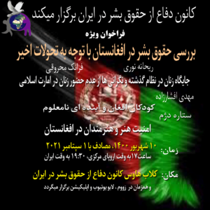 Menschenrechtsumfrage in Afghanistan Reyhaneh Noori und Faranak Mahrooghi :Der rechtliche Status von Frauen in Afghanistans vergangenem System und Bedenken über die Abwesenheit von Frauen in der neuen islamischen Regierung Mehdi Afsharzadeh :Afghanische Kinder und eine ungewisse Zukunft Setare Dezhm :Sicherheit von Kunst und Künstlern in Afghanistan Findet am 01.Sep.21 um 17:00 Uhr statt Tagungsort …