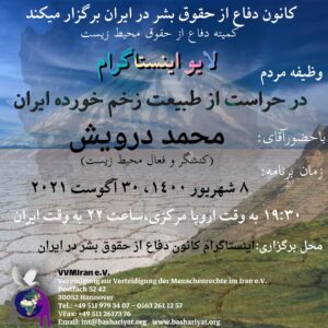 Am Donnerstag, den 18.August. 2021, um 19:00 Uhr mitteleuropäischer Zeit, fand unter Teilnahme von Ausschussmitgliedern und einer Gruppe von Menschenrechtsaktivisten eine Online-Sitzung des Verteidigungsausschuss der Kunst und Künstler-Rechte im Iran. Die Enthusiasten können die obige Sitzung aus den folgenden aufgezeichneten Dateien melden. Setare Dezhm : Anfang der Sitzung
