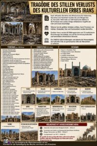 TRAGÖDIE DES STILLEN VERLUSTS DES KULTURELLEN ERBES IRANS Nach offiziellen Berichten des Ministeriums für Kulturerbe, Tourismus und Handwerk wurden bis zum Morgen des 12. Farvardin 1405 mehr als 130 historische Stätten in 18 Provinzen des Landes infolge militärischer Angriffe der USA und Israels beschädigt.