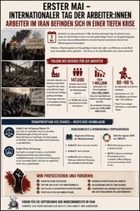 Erster Mai – Internationaler Tag der Arbeiter:innen Arbeiter im Iran befinden sich in einer tiefen Krise Anlässlich des bevorstehenden 1. Mai, des Internationalen Tags der Arbeiter:innen, sehen sich die Arbeiter im Iran unter dem gleichzeitigen Druck von Kriegsbedingungen und einer schweren Wirtschaftskrise mit einer Situation konfrontiert, die über ihre Belastungsgrenze hinausgeht.