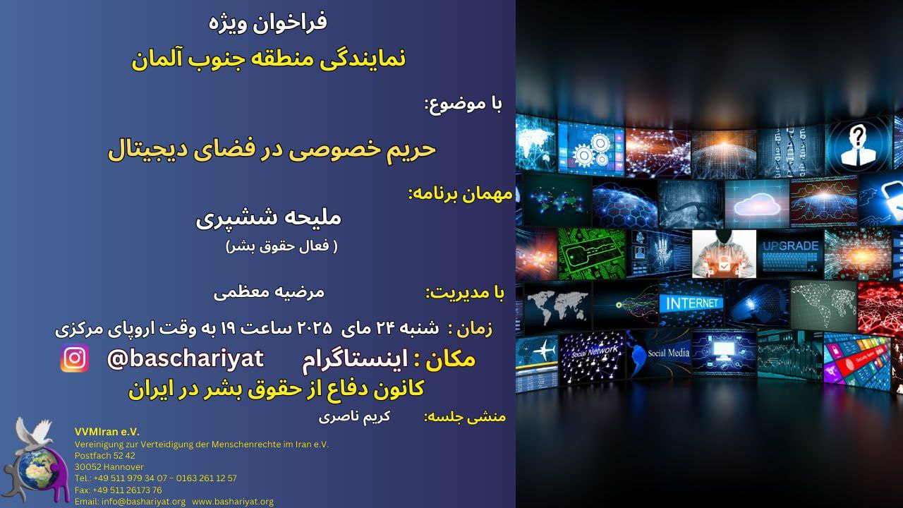 Die Instagram-Live-Sitzung der Vertretung Süddeutschlands fand am 24. Mai 2025 um 19:00 Uhr Mitteleuropäischer Zeit online über Instagram Live unter der Leitung von Marzieh Moazami statt.