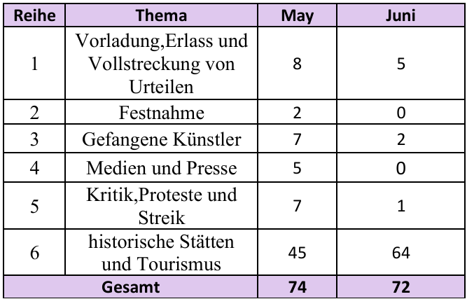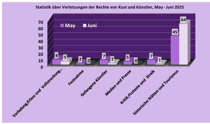 Nachrichten und Berichte im Zusammenhang mit Verletzungen der Rechte von Kunst und Künstlern wurden im Juni von Mitgliedern des Kunst- und Künstlerausschusses gesammelt.