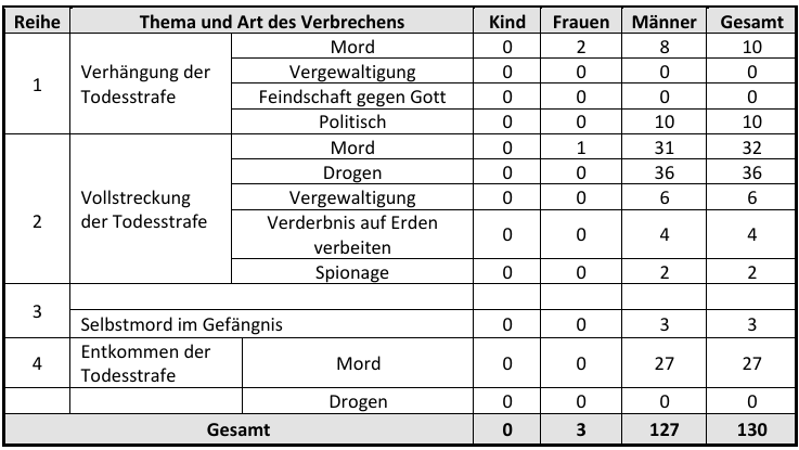 Die obigen Statistiken wurden aus Berichten in- und ausländischer Medien, die von der Regierung der Islamischen Republik Iran anerkannt sind, gesammelt und können praktisch nicht mehr als 25 bis 30 Prozent der gesellschaftlichen Realität darstellen.