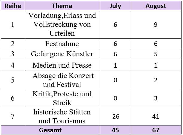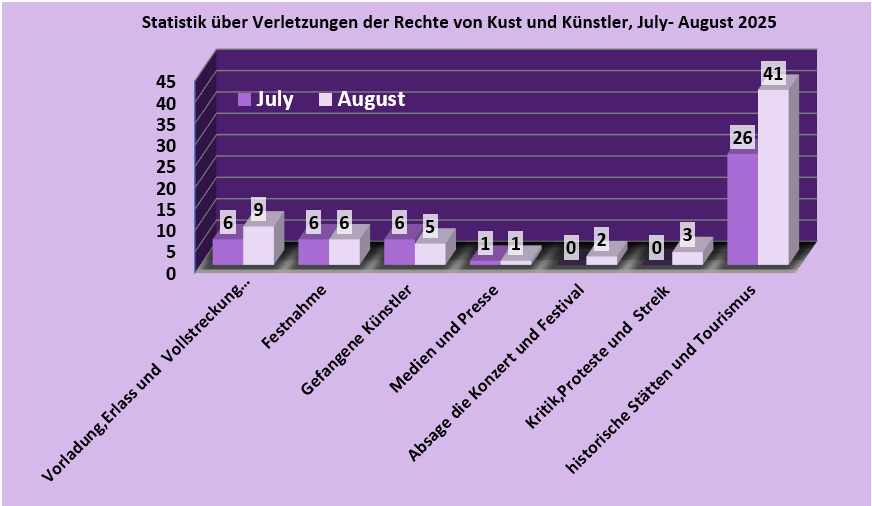 Nachrichten und Berichte im Zusammenhang mit Verletzungen der Rechte von Kunst und Künstlern wurden im August von Mitgliedern des Kunst- und Künstlerausschusses gesammelt.