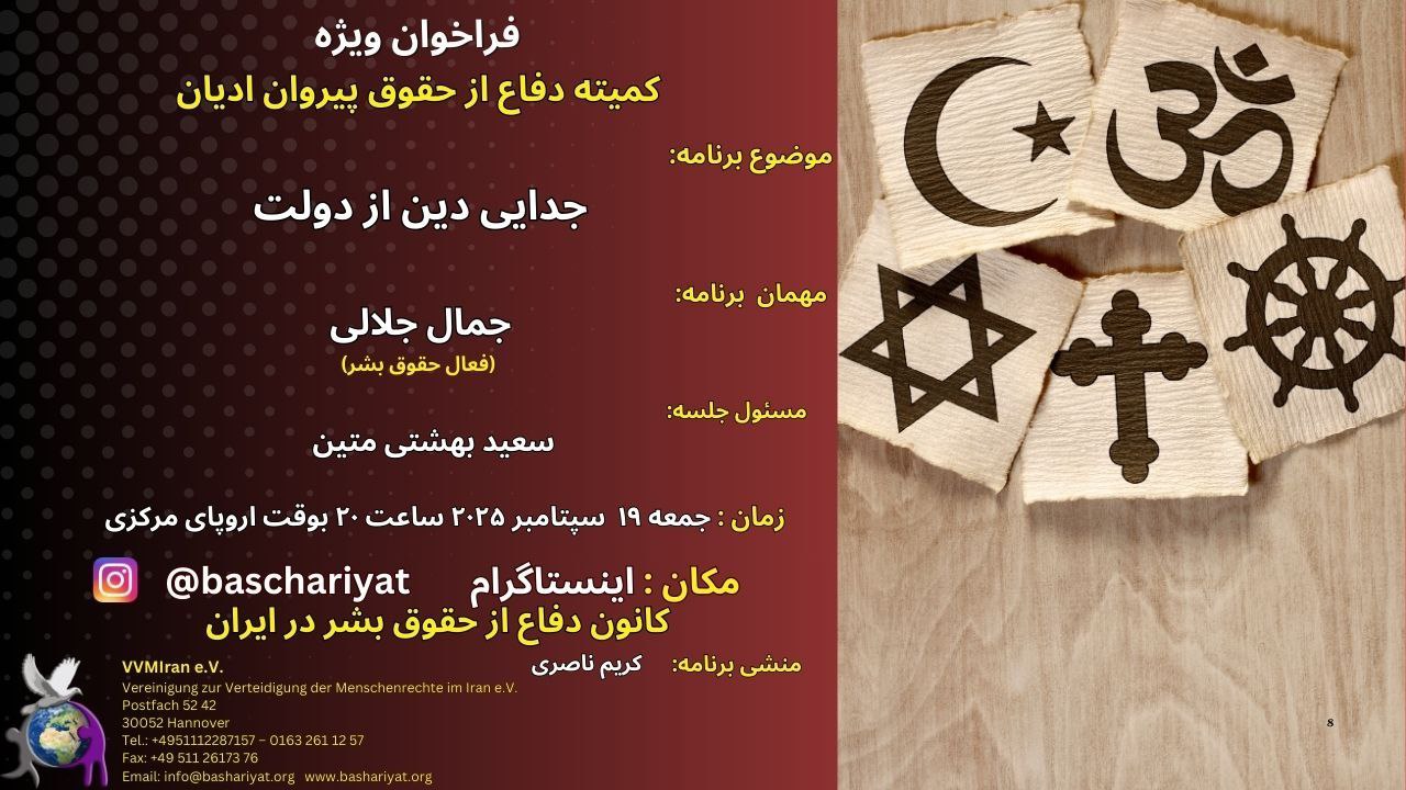 Die Live-Instagram-Sitzung des speziellen Aufrufs des Komitees zur Verteidigung der Rechte der Religionsanhänger im Iran fand am 19. September 2025 um 20:00 Uhr mitteleuropäischer Zeit virtuell über Instagram Live statt,