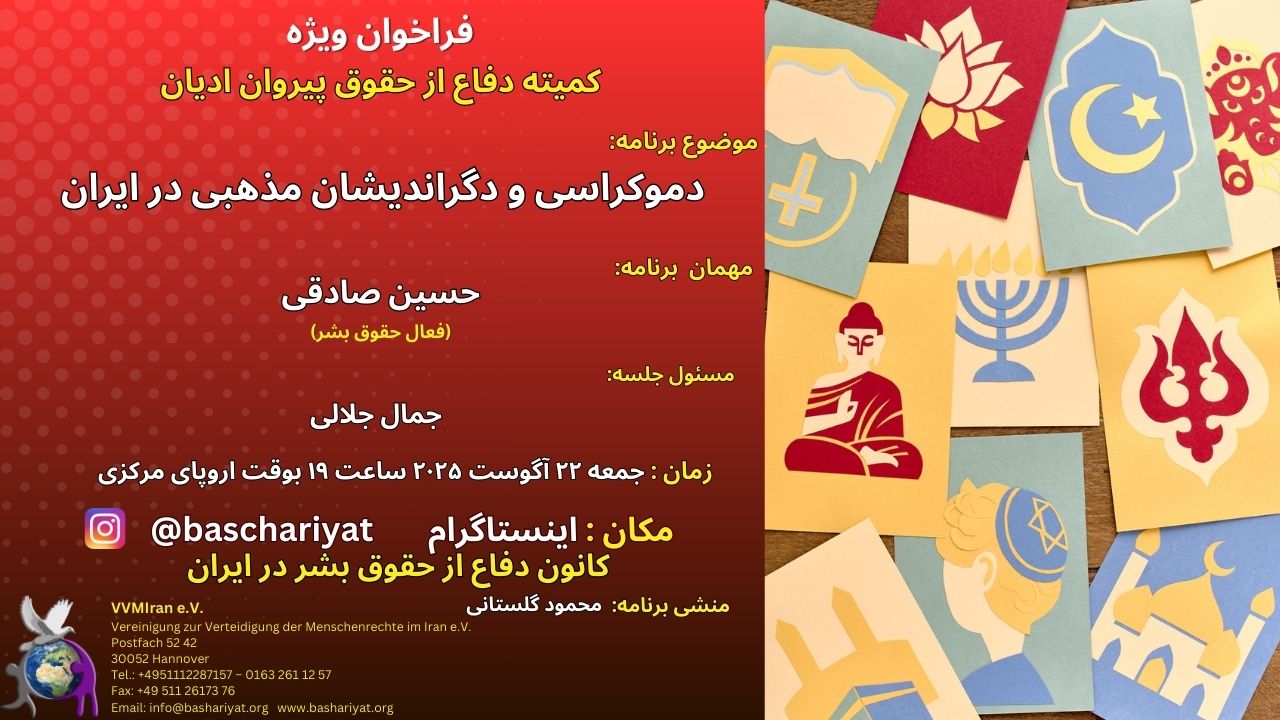 Die Live-Instagram-Sitzung des speziellen Aufrufs des Komitees zur Verteidigung der Rechte der Religionsanhänger im Iran fand am 22. August 2025 um 19:00 Uhr mitteleuropäischer Zeit virtuell über Instagram Live statt,