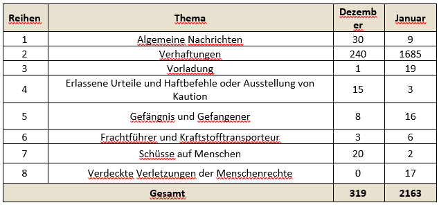 Diese statistischen Berichte wurden aus mehr als 280 Nachrichten erstellt, die im Laufe des Monats Januar 2026 gesammelt wurden.