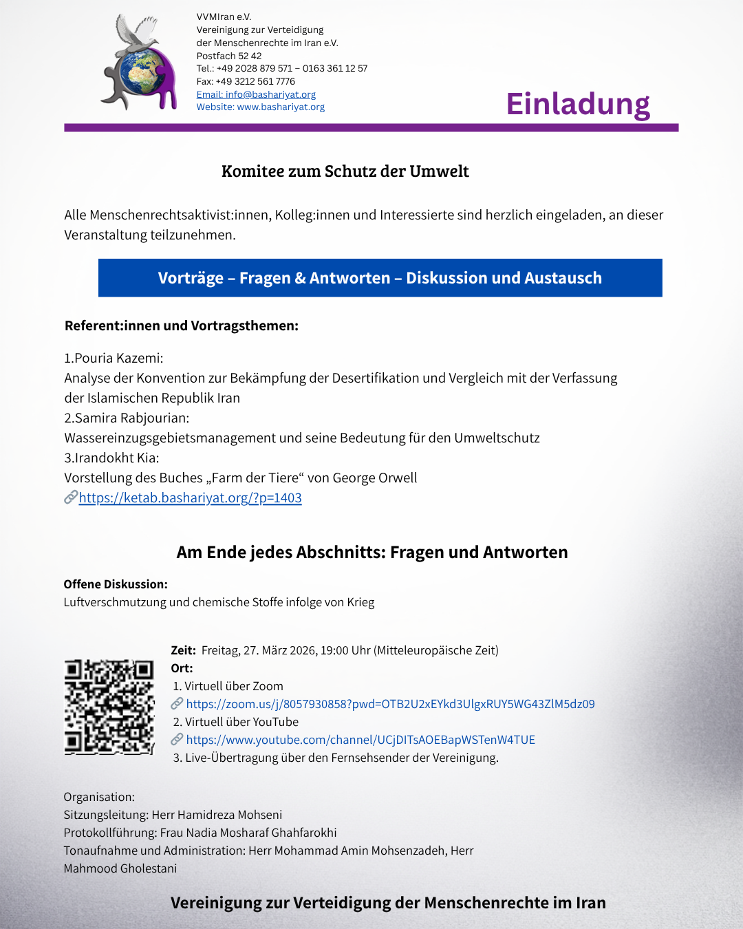 Einladung zur monatlichen ordentlichen Mitgliederversammlung der Vereinigung zur Verteidigung der Menschenrechte im Iran am 5. April 2026