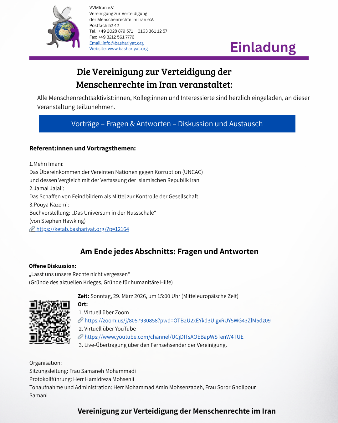 Einladung zur monatlichen ordentlichen Mitgliederversammlung der Vereinigung zur Verteidigung der Menschenrechte im Iran am 5. April 2026