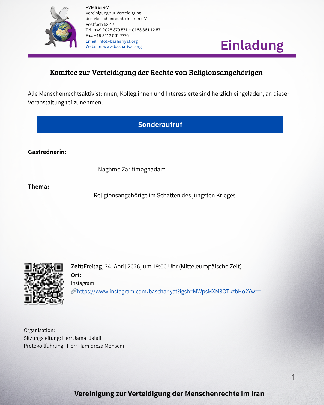 Einladung zur Generalversammlung des Zentrums für die Verteidigung der Menschenrechte im Iran am Montag, dem 26. April, 2026, um 15:00 Uhr (MEZ) im virtuellen Zoom-Raum.