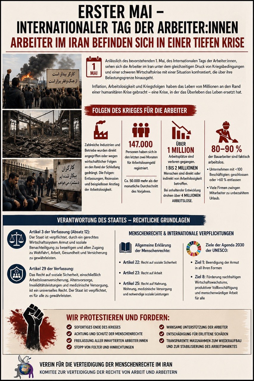 Im Bewusstsein dieses internationalen Tages erklären wir unseren Protest gegen die Lebensbedingungen der Bevölkerung, insbesondere der Arbeiter. Wir verurteilen entschieden den Krieg sowie die Maßnahmen der Regierung der Islamischen Republik Iran aufgrund weitreichender Menschenrechtsverletzungen, einschließlich Verhaftungen, Folter und beschleunigter Hinrichtungen unter dem Vorwand des Krieges, die Präsenz nicht-iranischer Kräfte in Städten sowie die wirtschaftliche Zerstörung des Landes.